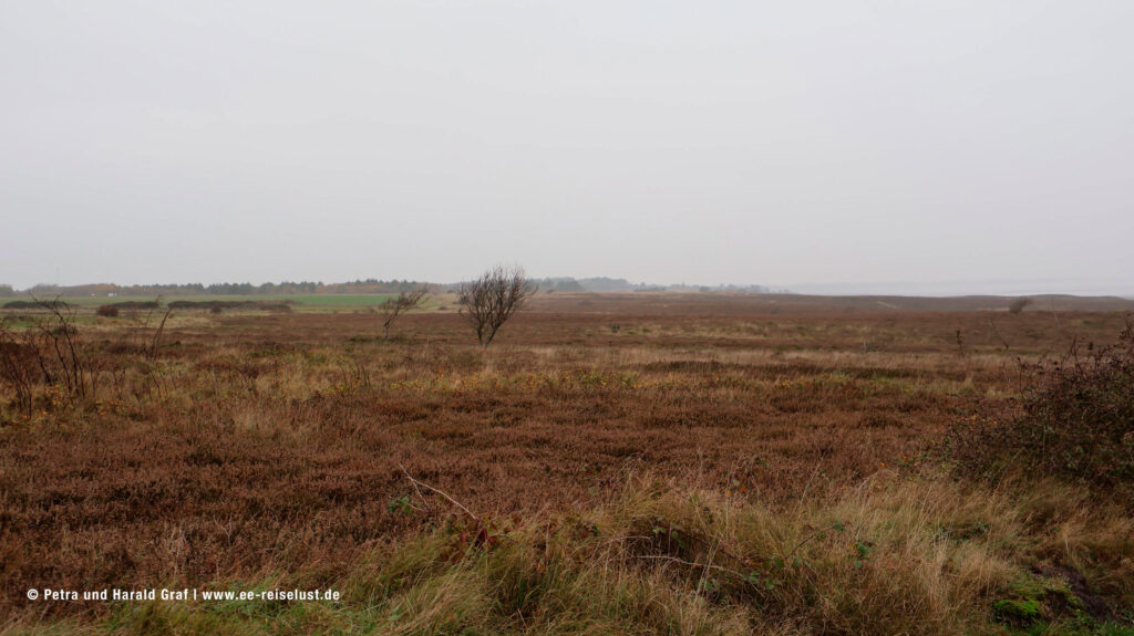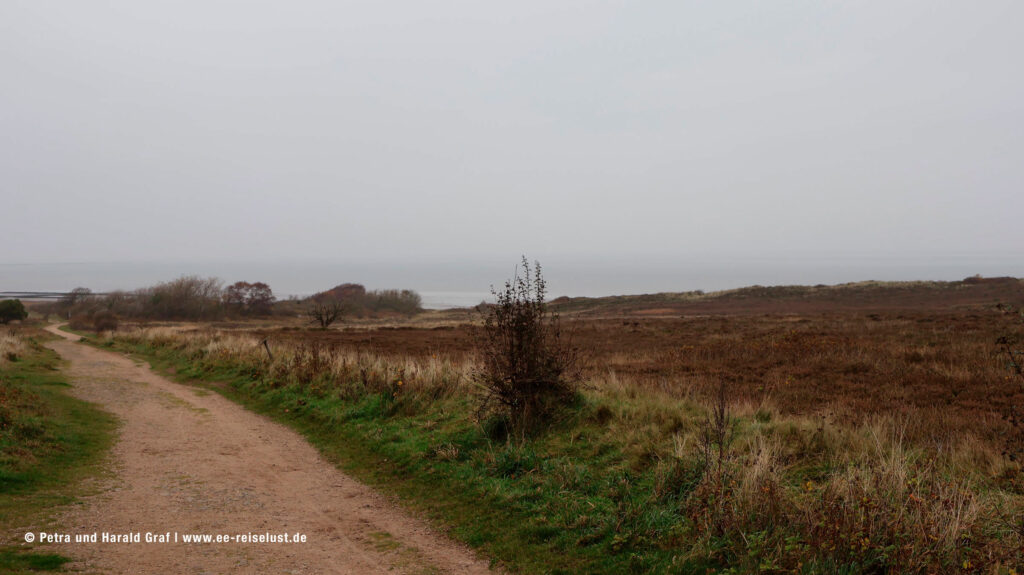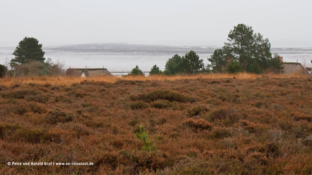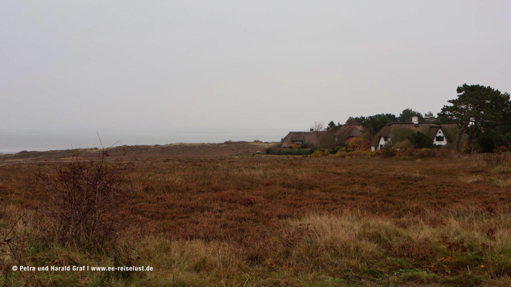 Leider konnten wir im November das lilafarbige Blütenmeer nur noch erahnen. Der feine Sandstrand am Wattenmeer muss einen super Kontrast bilden. Also überlegen, wann man nach Sylt fährt. (Beste Zeit für eine blühende Heide August, September). Wir hatten den Vorteil, dass wir fast alleine waren. Und auf unserem Weg konnten wir immer eine kleine Rast auf den aufgestellten Bänken einlegen und die Idylle in uns aufnehmen. Ein paar mit Reet gedeckte Häuser säumten unseren Weg und auch der Leuchtturm „Langer Christian“ begleitete uns.