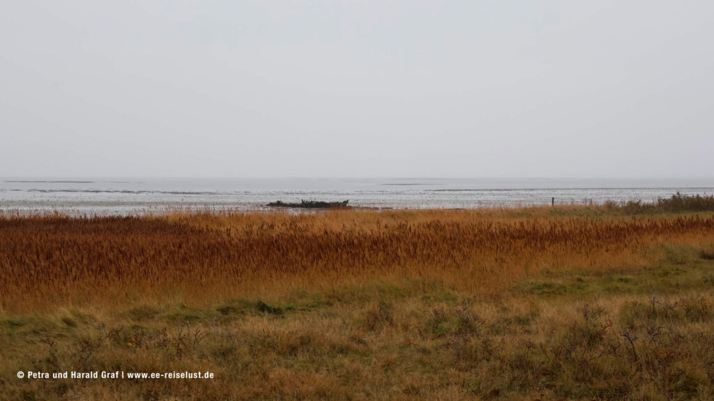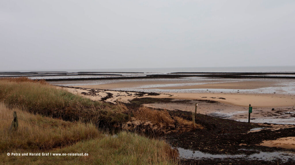 Leute, der war so was von lecker. Und die Bedienungen waren super freundlich, obwohl sie schon eine lange Saison hinter sich hatten und das Café sehr gut besucht war. Unser nächstes Ziel war der Wattwandersteg. Wir verließen das gemütliche Café auf dem Weg nach Westen bis wir rechts in den Stapelhooger Wai einbogen. Dem folgten wir bis wir wiederum rechts in den Wattweg und dann links in den Quellenweg einbogen. Am Ende des Wegs rechts, gleich wieder rechts und schon sieht man den Wattwandersteg. Am Ende des Bohlenwegs liegt das Wattenmeer.