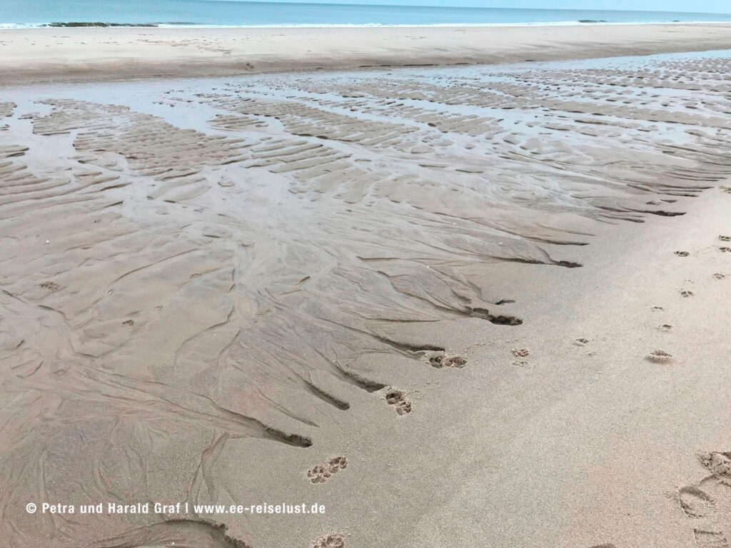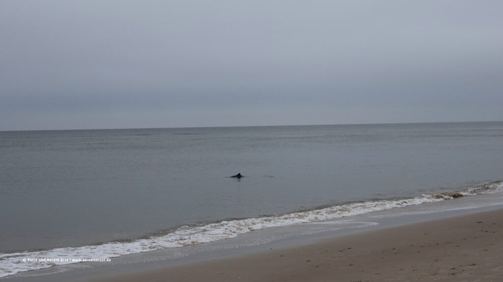 Nach ausgiebigem Frühstück machten wir uns auf den Weg. Runter zum Strand und Richtung Norden. Ebbe, super. Der Sand leicht feucht, aber fest. Und nicht viele Menschen unterwegs. Wir waren noch nicht lang unterwegs, da bemerkten wir etwas im Wasser. Wir konnten es kaum glauben – wir sahen eine Schule Delphine! Vermutlich Weißschnauzendelphine (auf Google nachgeschaut) klein und sehr schnell. Man kann sie nicht gut fotografieren. Leider waren sie nicht so fotogen wie Flipper. Nach einigen Versuchen – wir bekamen mal einen Rücken, mal einen Schwanz aufs Bild – gaben wir es auf und gingen weiter.