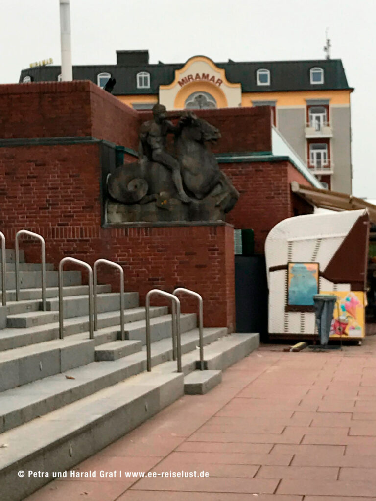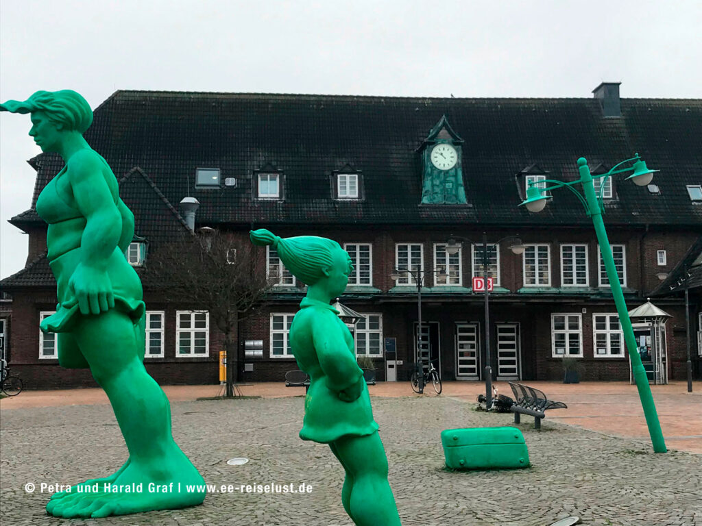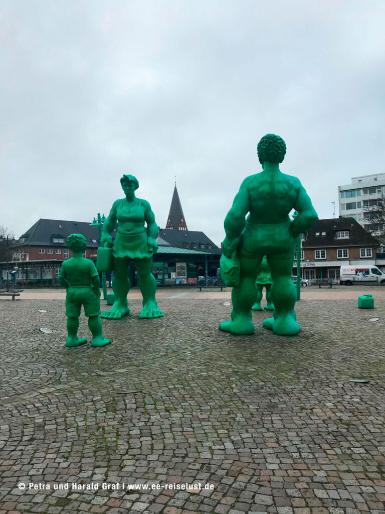 Auf der Sylter Website liest man dazu: „Die knallgrünen Figuren mit verdrehten Köpfen und ungleichmäßigen Proportionen gehören seit 2001 zum Westerländer Bahnhof und sind somit sein Wahrzeichen. (Weiterlesen auf sylt.de ).