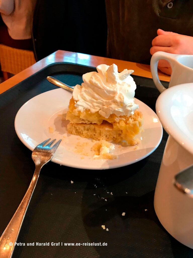 Wir suchten uns im Inneren einen Platz am Fenster und bestellten Kaffee und Rooibostee, dazu Aprikosenkuchen mit Vanillecreme und Sahne.
