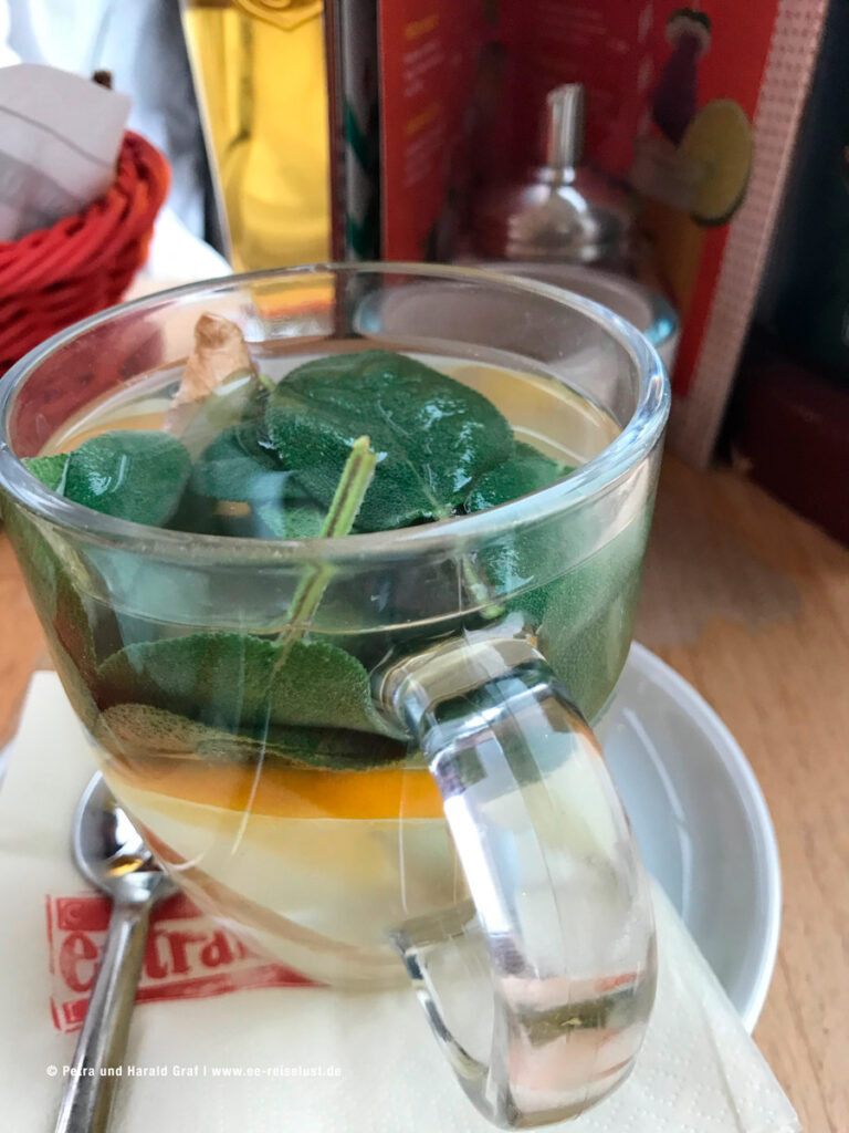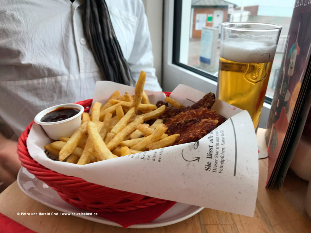 Ich hatte daheim schon recherchiert und bin auf „Cafe Extrablatt“ (einfach Cafe Extrablatt sylt eingeben) gestoßen. Wir gingen hinauf in den 1. Stock, der durch viele Fenster schön hell und mit Korbstühlen eingerichtet ist. Auch hängen lustige Bilder an der Wand. Ein Ort, an dem man sich sofort wohl fühlt. Bei einem freundlichen Ober bestellten wir „Salbei-Orangen-Ingwer-Tee“, mit frischen Salbeiblättern, Orangen- und Ingwerscheiben und Honig in einem Schälchen. Dazu eine Gulaschsuppe (aus Rindergulasch) mit gebackenem Pizzabrötchen, und „Chicken Crispers mit Pommes und Dipp, dazu ein Becks. Es schmeckte köstlich.