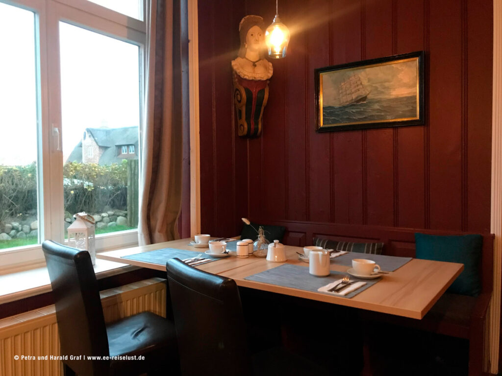 Wir umrundeten den Teich. Die Friesenkapelle, die wir uns anschauen wollten, war leider geschlossen, wie die meisten Kirchen mittlerweile. Auf dem Heimweg kamen wir an dem Café „Sylter Domizil“ vorbei.