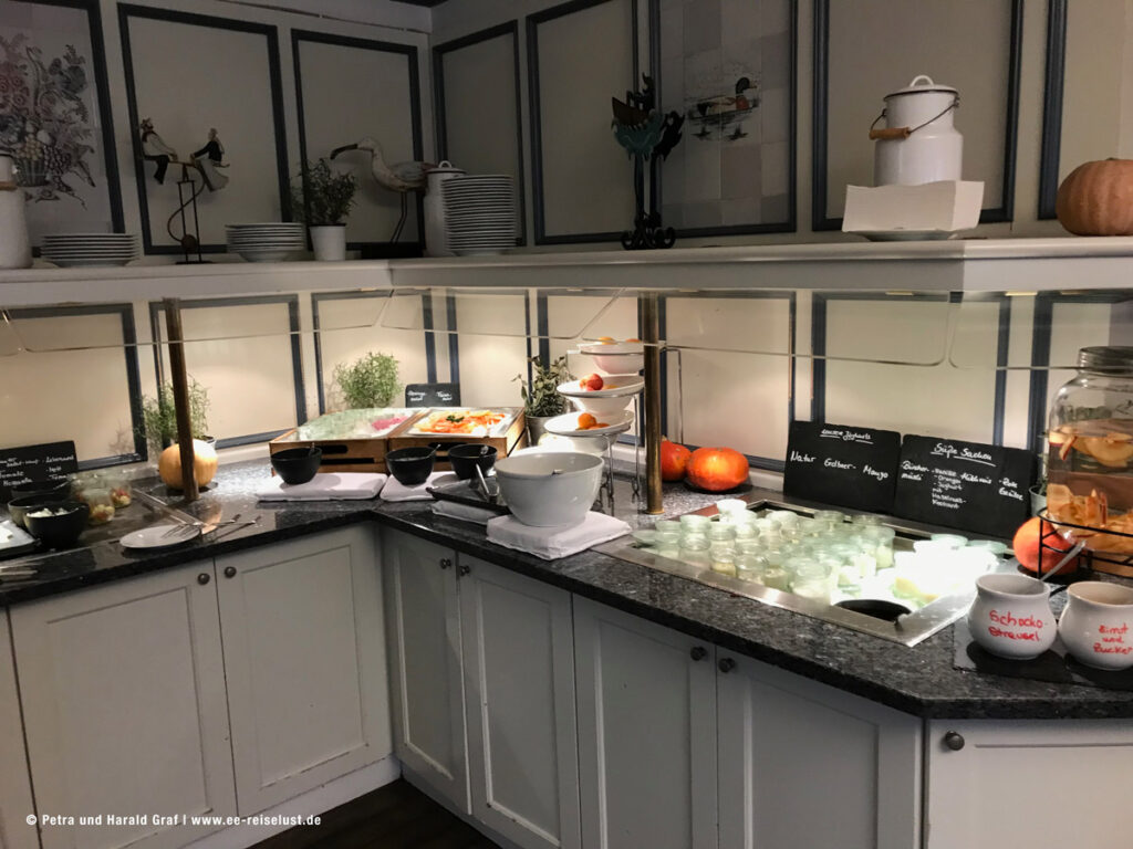 Ausgeschlafen und gut erholt machen wir uns gegen 8.00 auf zum Frühstück. Der Frühstücksraum ist etwas verwinkelt, aber heimelig und das Frühstücksbüffet extrem lecker. Wurst, Käse, Fisch, Obst, verschiedene Semmeln (für Nichtbayern Brötchen) und Brote, Müsli, Joghurt. Kaffee aus dem Automaten, Tee an der Teebar. Sogar Sekt gab es (ist ja gut für den Kreislauf)