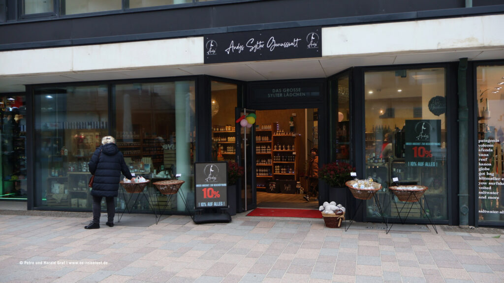 In der Fußgängerzone angekommen blieben wir am Sylter Teehaus Teekula stehen. Eine nette junge Frau bot uns heißen Tee an. In kleinen Bechern. Lecker. Und Lust auf mehr. Innen im Laden gab es nochmals verschiedene Teeproben, die freigiebig verteilt wurden. Zum Schluss war unser Körbchen, das wir uns mittlerweile besorgt hatten, gut gefüllt. Sorten, die ich noch nie gehört hatte, grüner Tee mit weißem Tee, Tee zum Essen, man war im Schlaraffenland des Tees. Aber es gab noch mehr im Angebot: Marmeladen, Bonbons, Kekse, Schokoladen-Spezialitäten und, und, und. Für alle Teefans ein MUSS. Frohen Mutes verließen wir mit einer dicken Tüte den Teeladen und freuten uns schon jetzt, auf ein bisschen Syltfeeling zuhause. Weiter die Einkaufsmeile entlang. Da mein Mann sich seit einiger Zeit für Whisky interessiert, blieb er plötzlich abrupt stehen. Ich schaute auf das Schaufenster, „Andys Sylter Genusswelt“ stand da und mein Mann war schon drinnen.