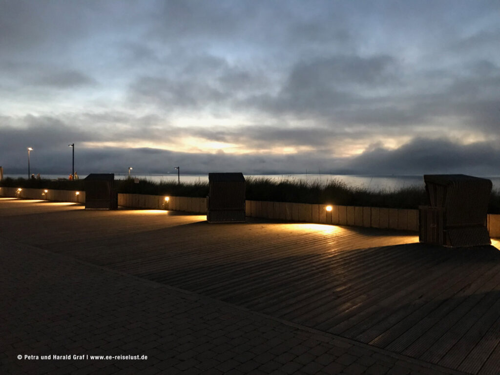 Was das „Kompass“ besonders attraktiv macht, ist die Mittags-Karte, die von 12.00 – 17.00 Uhr gilt. Wir bestellten Sylter Currywurst mit Pommes (EUR 11,90) für meinen Mann und Matjes nach Hausfrauenart (EUR 14,90) für mich. Am Meer muss es für mich Fisch sein. Die Currywurst war sehr lecker, aber leider wieder nur lauwarm. Vielleicht gehört das auf Sylt so. Mit gefülltem Bauch verließen wir das Lokal und schlenderten bis zum Ende der Fußgängerzone. Als es bereits dunkel wurde, machten wir uns auf den Heimweg. Auf dem schön beleuchtetem Weg oberhalb des Strandes, gingen wir gemütlich dahin. Leider machten wir 2 dumme Fehler: