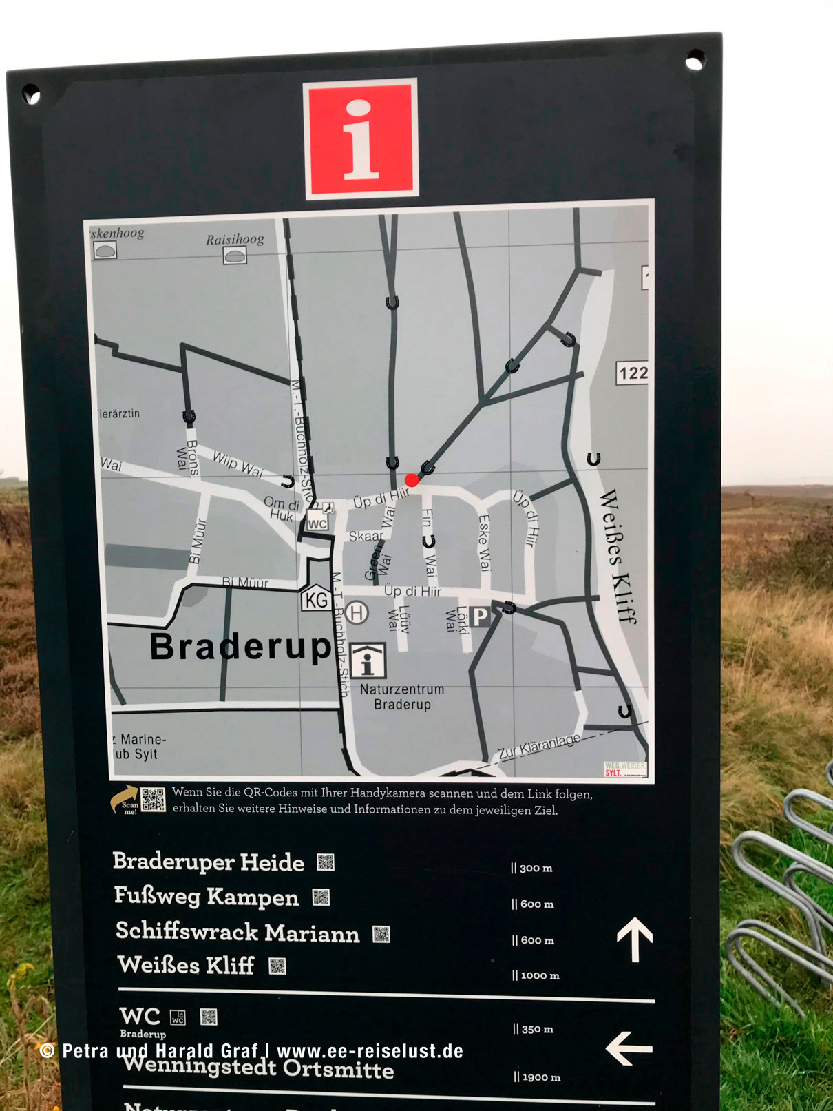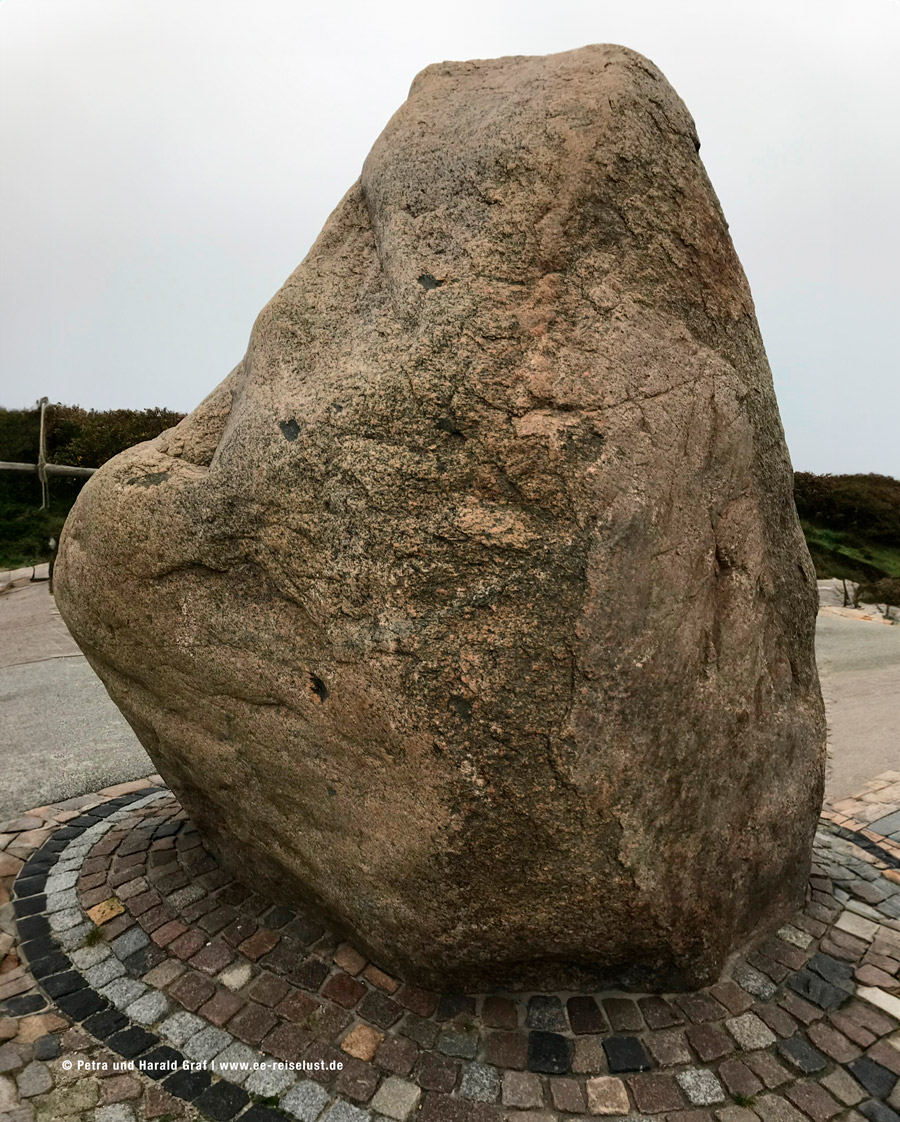 Rechter Hand ist jetzt das Rote Kliff. Weiter nach Norden. Am Parkplatz an der Sturmhaube bogen wir rechts ab und kamen zum Kampener Findling vom roten Kliff. Zur Historie ist auf der Informationstafel unter anderem zu lesen: „Der Findling vom Roten Kliff ist ein etwa 20t schwerer, 3,50 m hoher und mehr als eine Milliarde Jahre alter Stein. Es handelt sich um einen Gneis aus dem Gebirge Skandinaviens. Im März 2005 wurde er neben einer Buhne (Erklärung: Eine Buhne, ist ein meist rechtwinklig zum Strandverlauf in ein Meer vorgebauter Damm, der dem Küstenschutz dient) am Hauptstrand geborgen“.