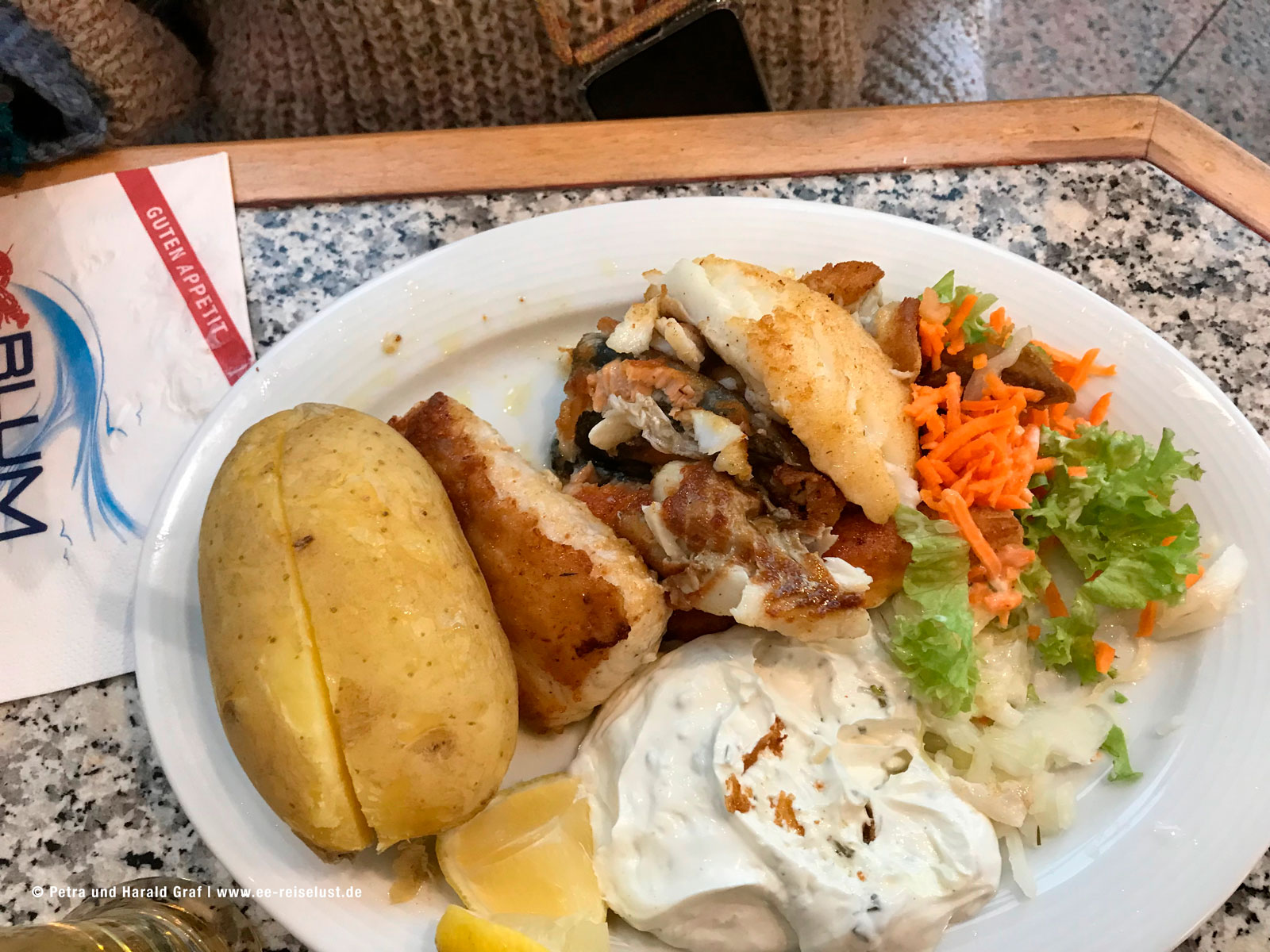Heute bestellten wir Lachsfilet mit Garnelen, Beilage und Salat. Und Blums Nordseeteller mit drei verschiedenen Fischfilets, Beilage und Salat. Getrunken wurde ein Grauburgunder und ein alkoholfreies Flens.