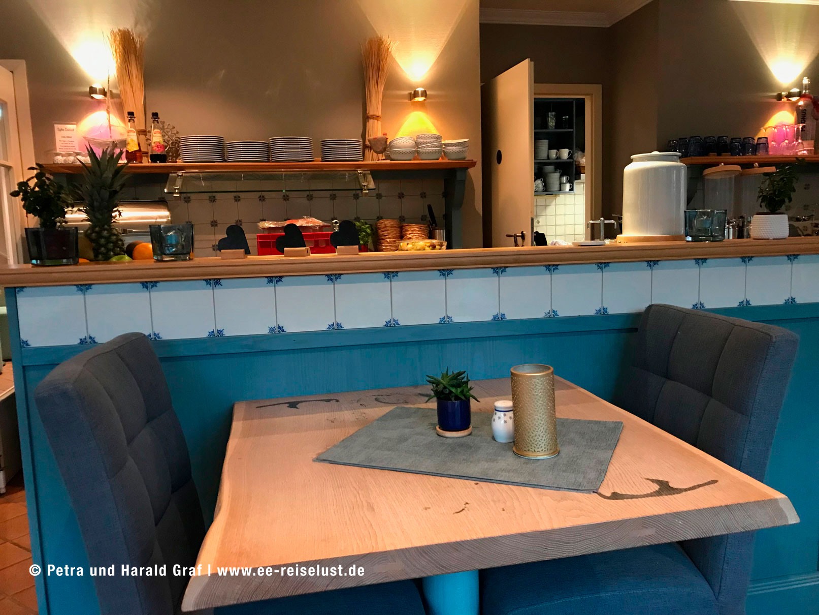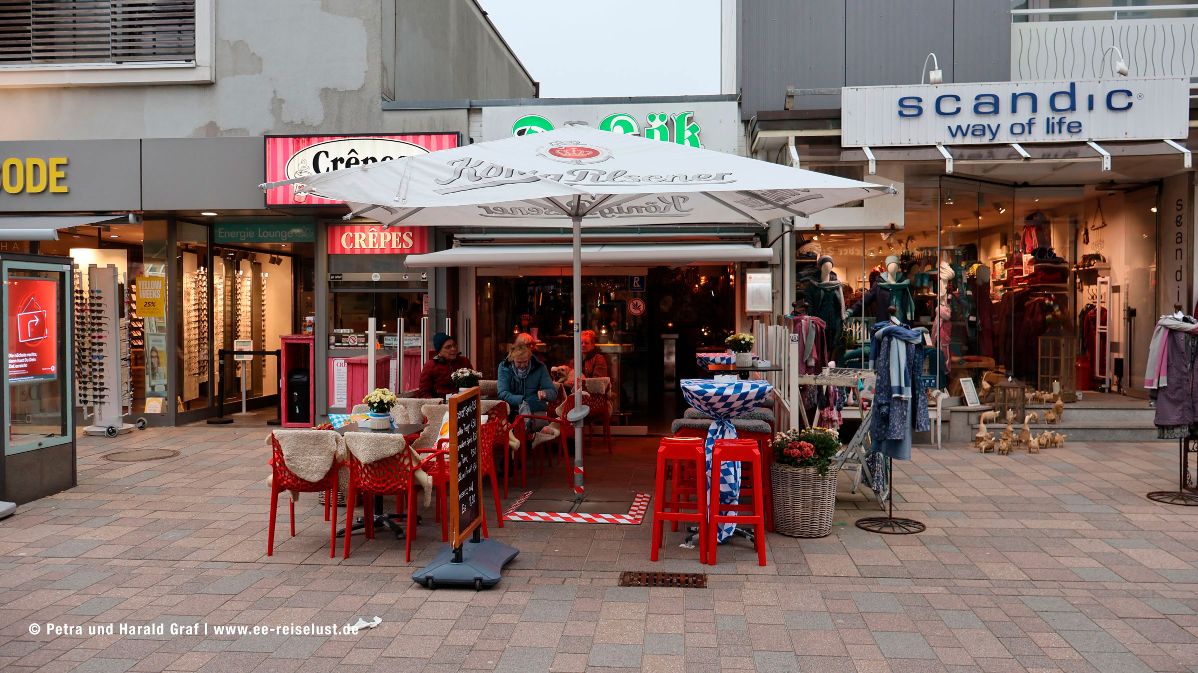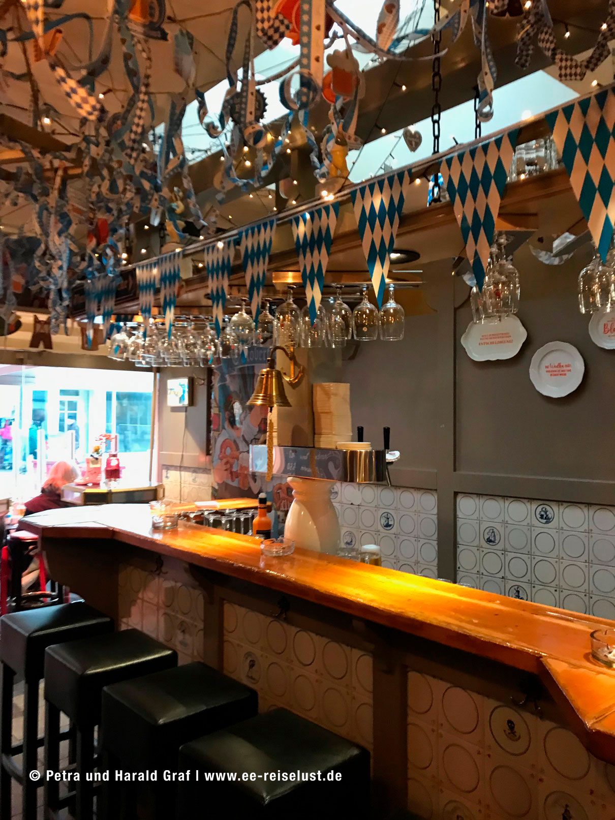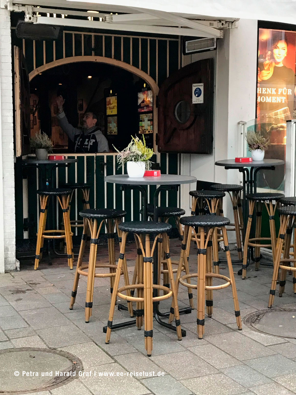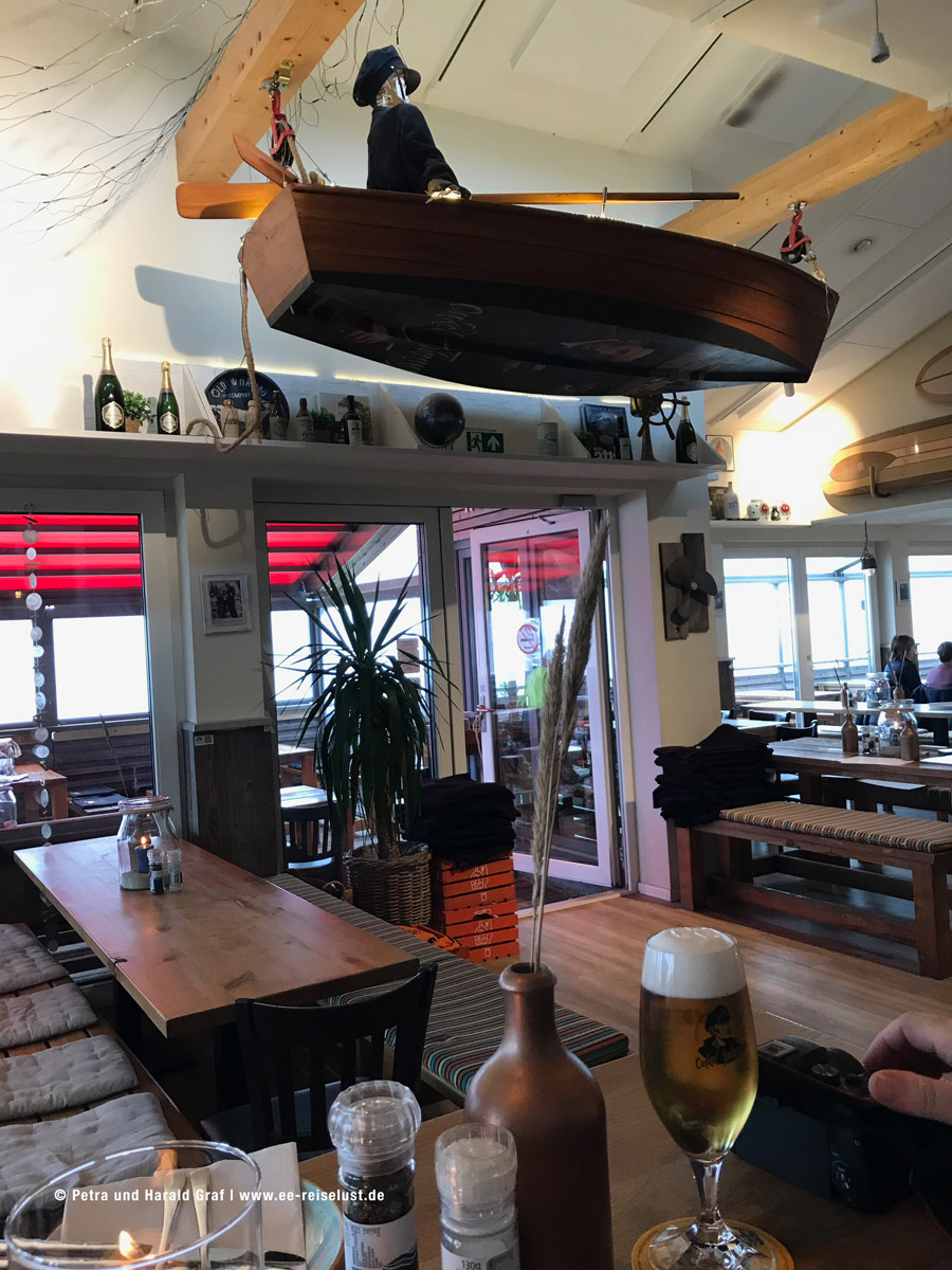 Auf dem Weg zur Bushaltestelle kamen wir noch an zwei urigen Lokalitäten vorbei. Im „De Kök“ fühlten wir uns nach München, zur Oktoberfestzeit versetzt, weiß-blaue Wimpel und etliches Dekor hing von der Decke. Kaffee und Grog waren gut und wärmten wieder innerlich. Irgendwie war es cool dort.