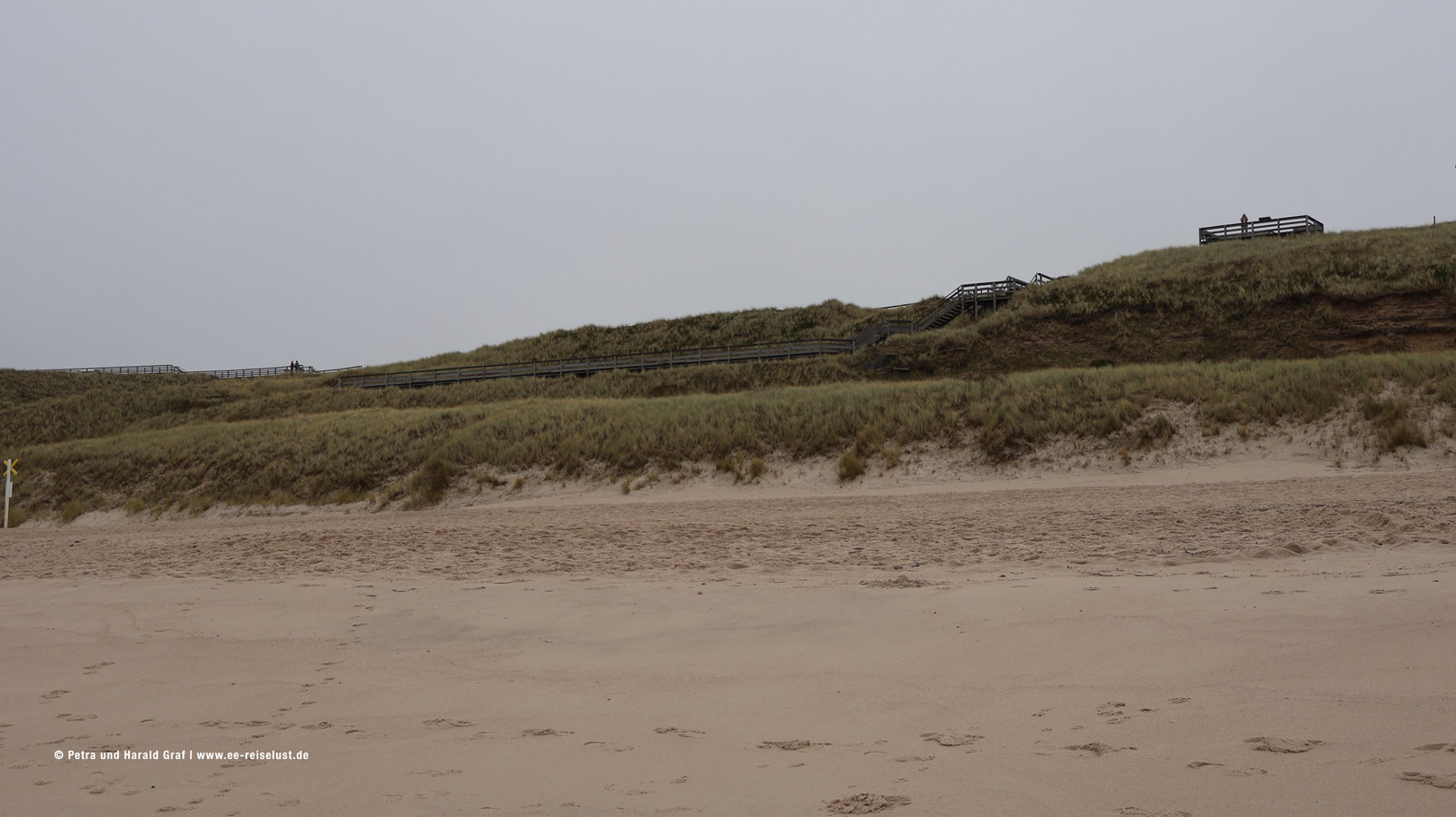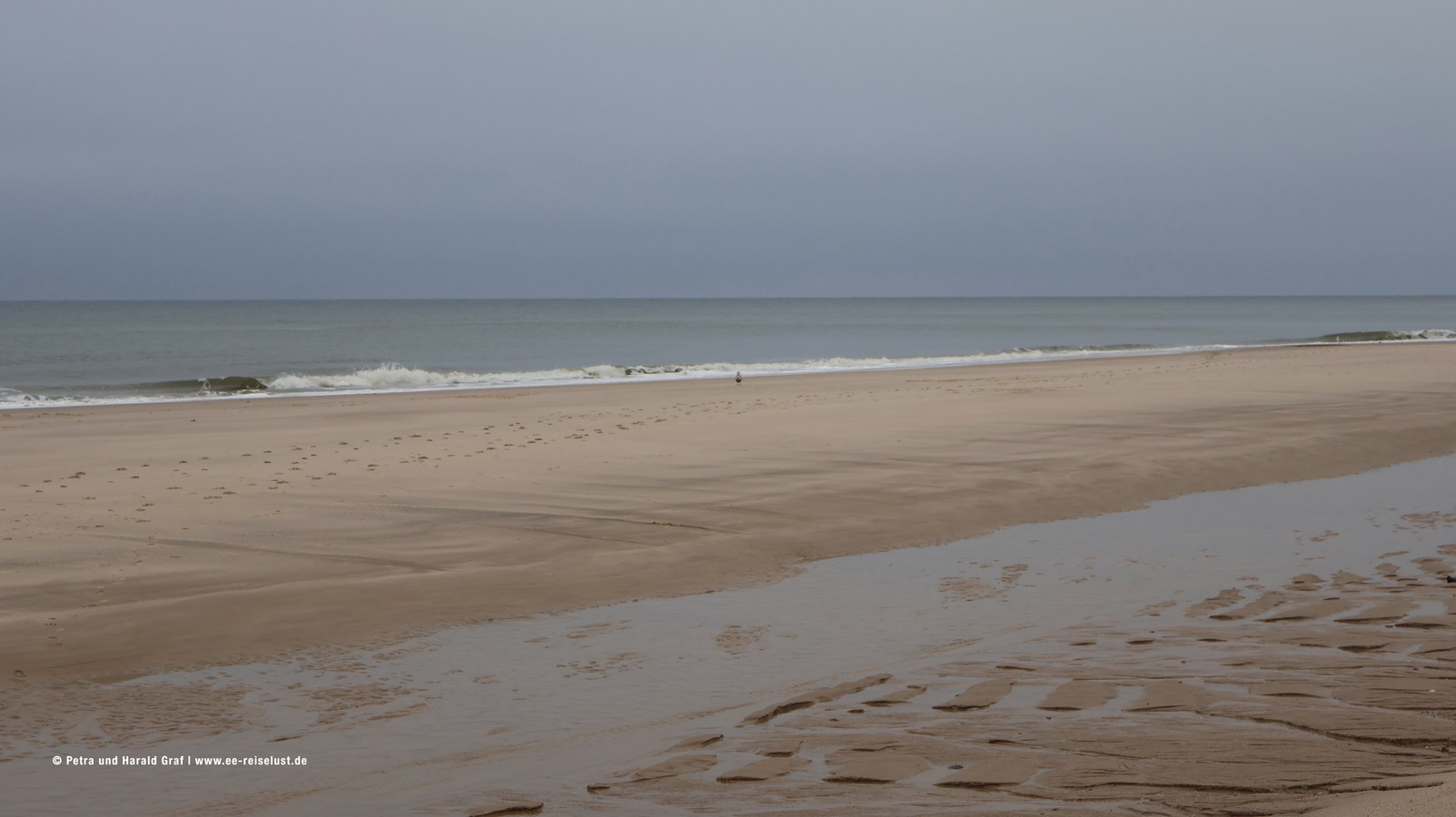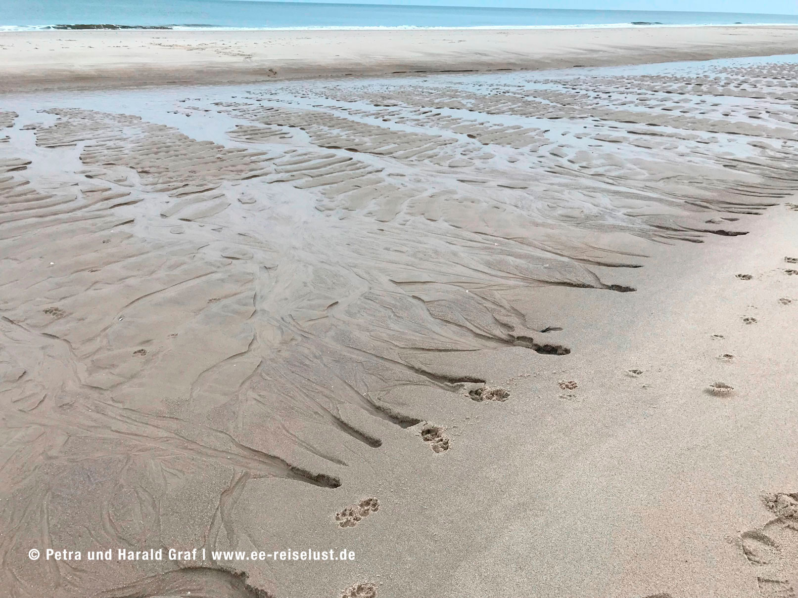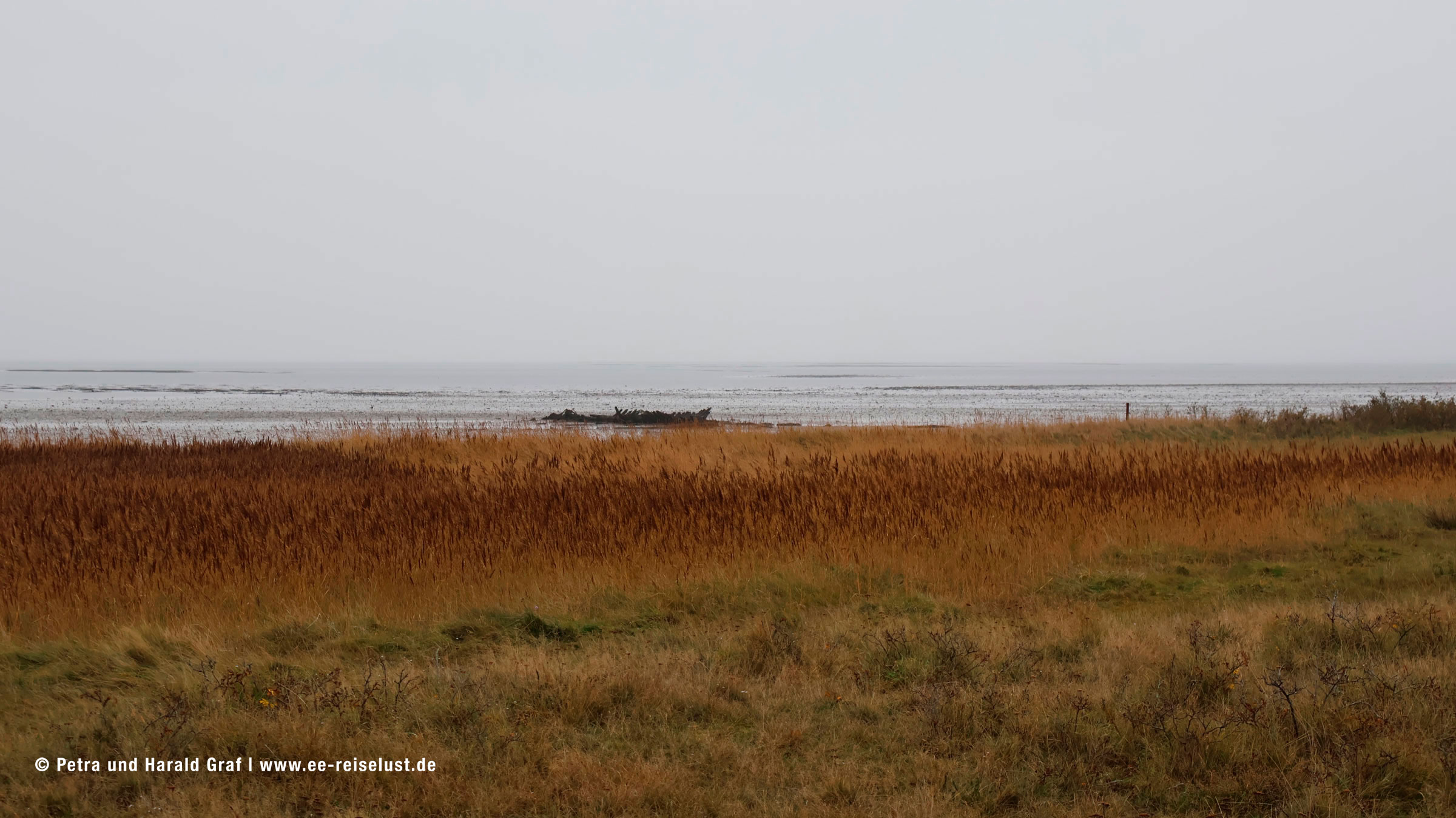 Hier zieht sich das Wasser bei Ebbe so weit zurück, dass nur bei Flut gebadet werden kann. Anscheinend hatten wir gerade Ebbe, denn viel Wasser war nicht zu sehen. Wir wandten uns nach Norden und gingen am Strand entlang bis zum Wrack Mariann. Zur Geschichte des schwedischen Dreimastschoners findet man ausführliche Informationen auf der Website „Michels Hüs“ der Familie Christiansen: