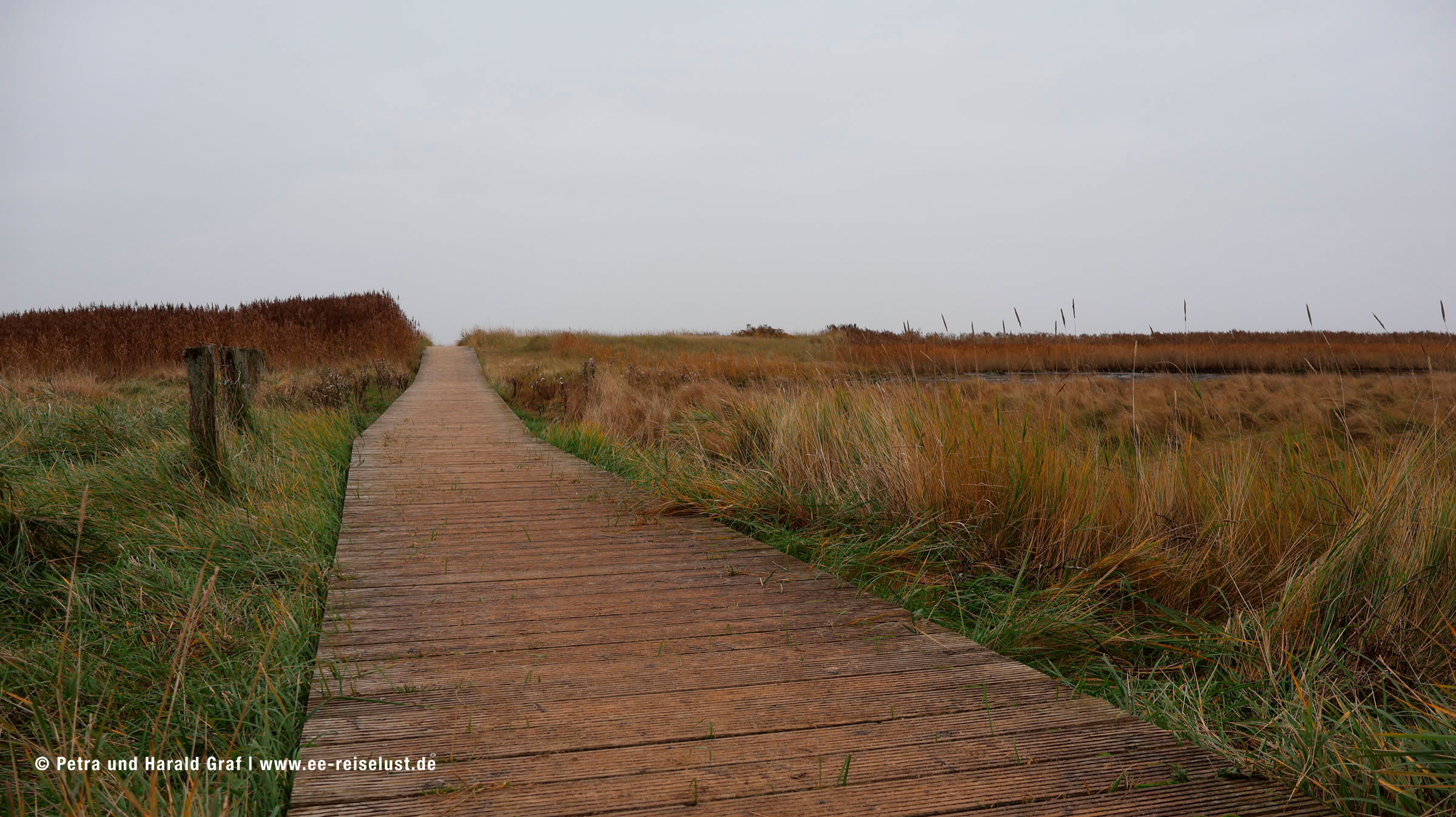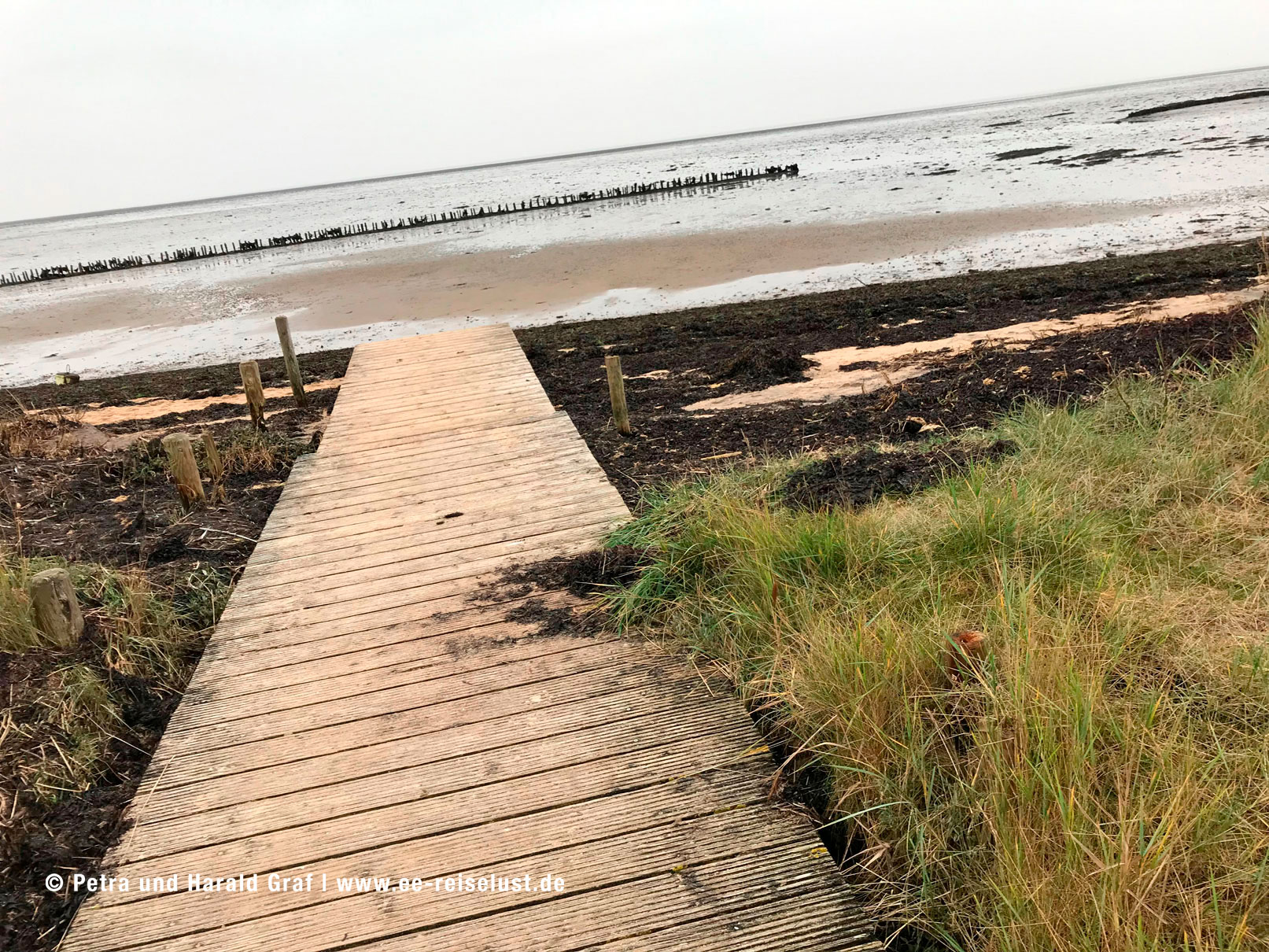 Leute, der war so was von lecker. Und die Bedienungen waren super freundlich, obwohl sie schon eine lange Saison hinter sich hatten und das Café sehr gut besucht war. Unser nächstes Ziel war der Wattwandersteg. Wir verließen das gemütliche Café auf dem Weg nach Westen bis wir rechts in den Stapelhooger Wai einbogen. Dem folgten wir bis wir wiederum rechts in den Wattweg und dann links in den Quellenweg einbogen. Am Ende des Wegs rechts, gleich wieder rechts und schon sieht man den Wattwandersteg. Am Ende des Bohlenwegs liegt das Wattenmeer.