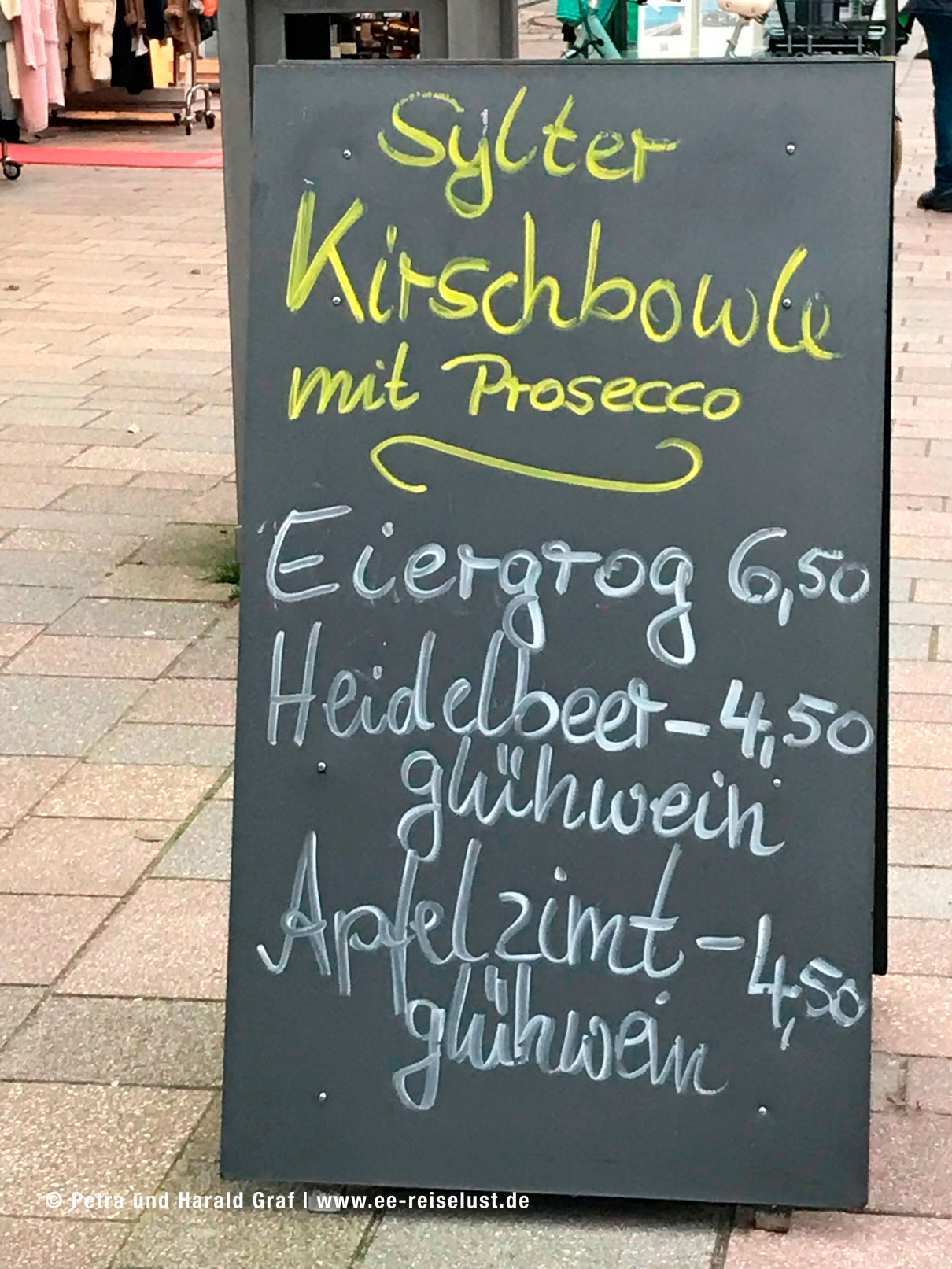 Auf einer Anrichte im Hotel stand ein Wasserspender mit Orangen- und Zitronenscheiben, an dem ich gleich 2 Gläser hintereinander trank. Bewegung macht durstig. Ein Korb mit Äpfel, einer gehörte mir, und eine Platte mit kleinen Muffins. Lecker und das für lau. Wir befreiten unsere Wanderstiefel vom Sand an der Putzmaschine und gingen auf unser Zimmer. Ein bisschen Ruhe, bevor es nach Westerland ging, um im „Kompass“ zu essen. Nach ca. einer Stunde machten wir uns auf den Weg zur Bushaltestelle. Wir fuhren bis zur Haltestelle „Friedrichstraße Ost“ in Westerland, und liefen ein paar Meter zurück zur Friedrichstraße. Dort beginnt die Fußgängerzone. Jetzt schon wieder mit Appetit steuerten wir zielstrebig das „Kompass“an.
