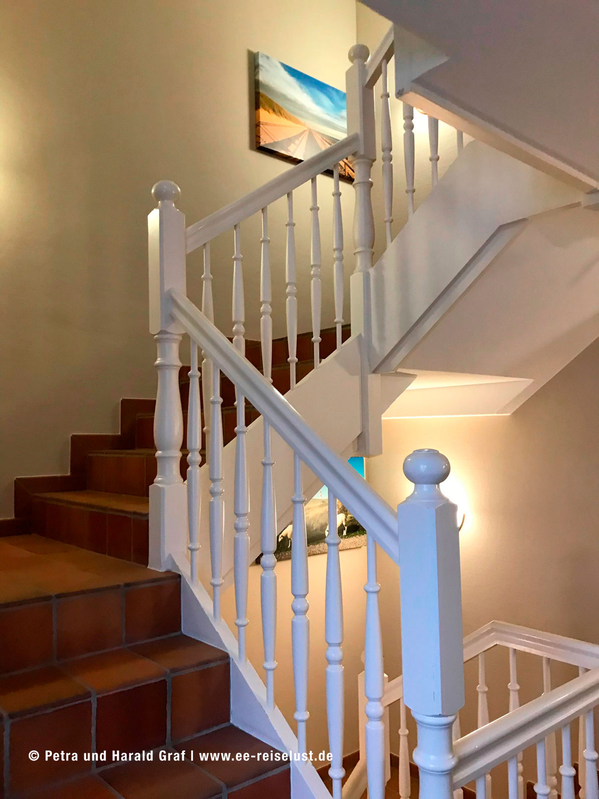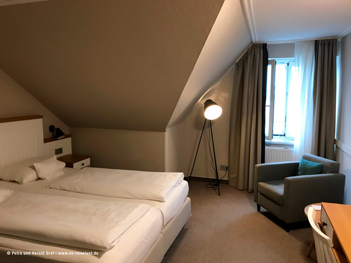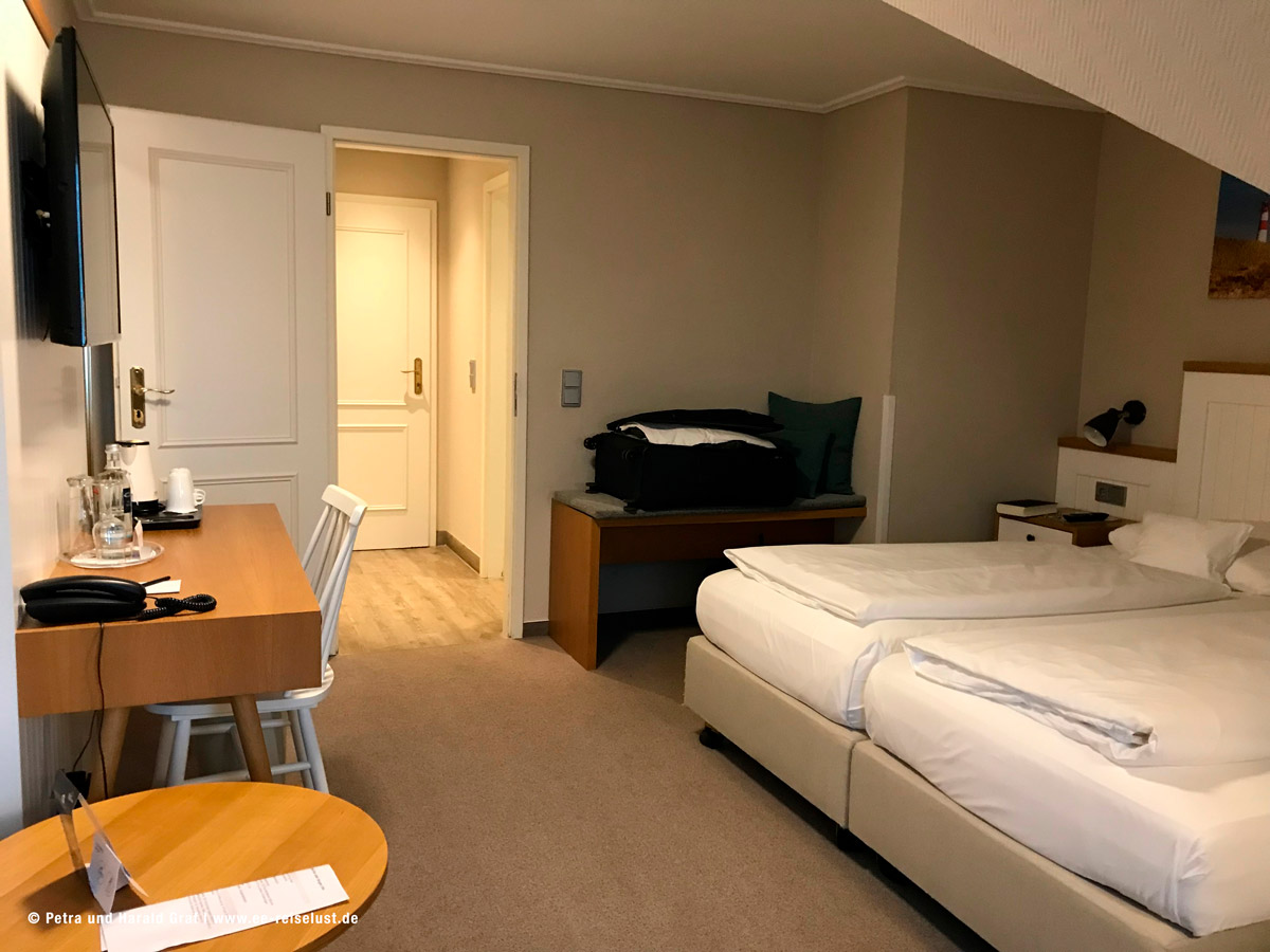Das Hotel ist sehr hübsch eingerichtet. Die junge Frau an der Rezeption war sehr freundlich, erkundigte sich, ob wir eine gute Anreise hatten und händigte uns unsere Zimmerkarten aus. Ich weiß nicht warum, aber wir bekommen immer Zimmer in den höheren Stockwerken. Wahrscheinlich sehen wir so sportlich aus. 🙂 Diesmal war es der 3. Stock. Ich verweigerte den Aufzug und schleppte mich drei Stockwerke hoch. Oben wurde ich belohnt. Das Zimmer war schnuckelig mit Blick aufs Meer.