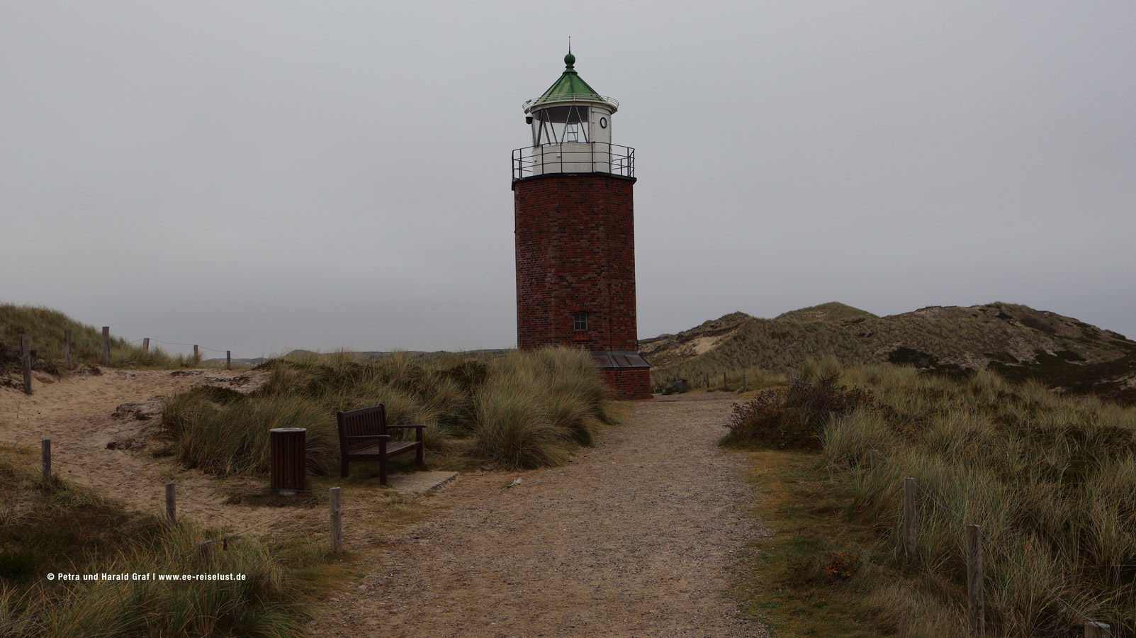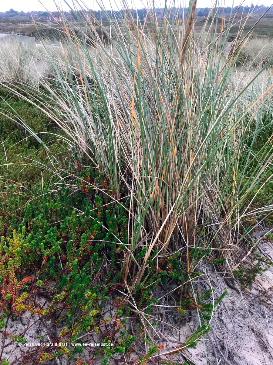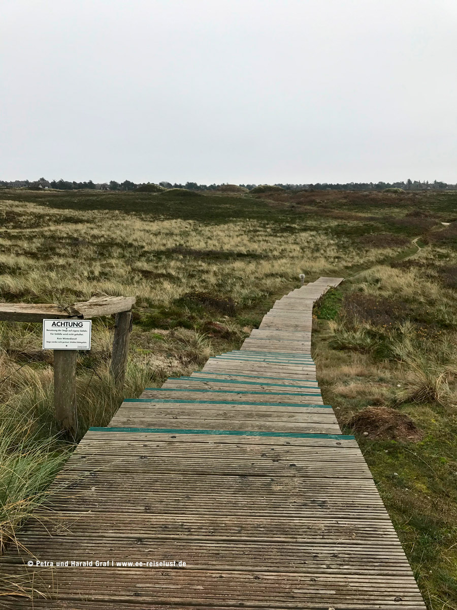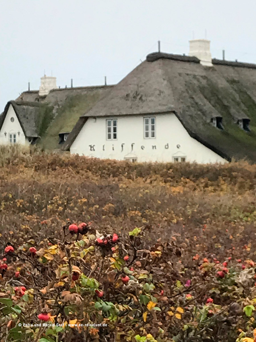 Leider konnten wir im November das lilafarbige Blütenmeer nur noch erahnen. Der feine Sandstrand am Wattenmeer muss einen super Kontrast bilden. Also überlegen, wann man nach Sylt fährt. (Beste Zeit für eine blühende Heide August, September). Wir hatten den Vorteil, dass wir fast alleine waren. Und auf unserem Weg konnten wir immer eine kleine Rast auf den aufgestellten Bänken einlegen und die Idylle in uns aufnehmen. Ein paar mit Reet gedeckte Häuser säumten unseren Weg und auch der Leuchtturm „Langer Christian“ begleitete uns.