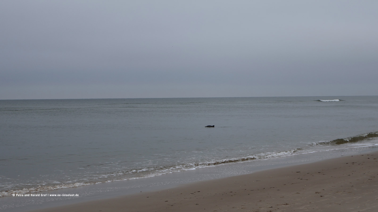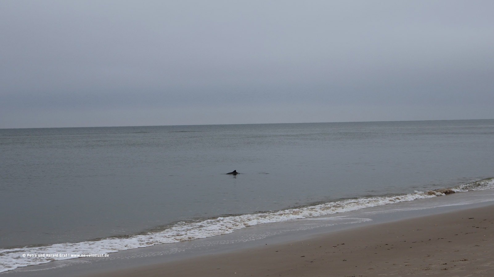 Nach ausgiebigem Frühstück machten wir uns auf den Weg. Runter zum Strand und Richtung Norden. Ebbe, super. Der Sand leicht feucht, aber fest. Und nicht viele Menschen unterwegs. Wir waren noch nicht lang unterwegs, da bemerkten wir etwas im Wasser. Wir konnten es kaum glauben – wir sahen eine Schule Delphine! Vermutlich Weißschnauzendelphine (auf Google nachgeschaut) klein und sehr schnell. Man kann sie nicht gut fotografieren. Leider waren sie nicht so fotogen wie Flipper. Nach einigen Versuchen – wir bekamen mal einen Rücken, mal einen Schwanz aufs Bild – gaben wir es auf und gingen weiter.