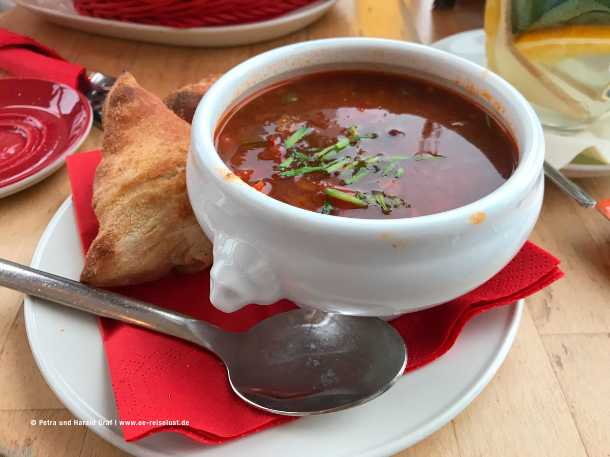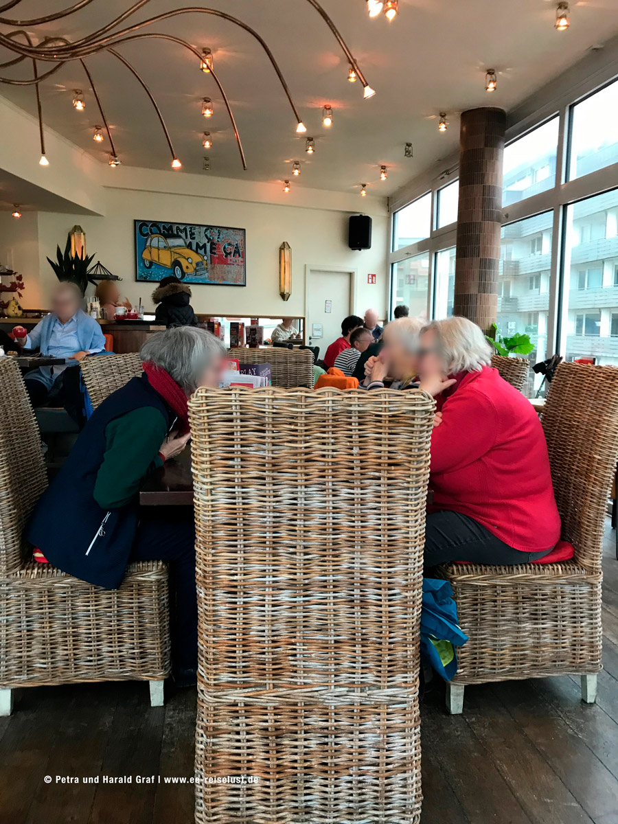 Ich hatte daheim schon recherchiert und bin auf „Cafe Extrablatt“ (einfach Cafe Extrablatt sylt eingeben) gestoßen. Wir gingen hinauf in den 1. Stock, der durch viele Fenster schön hell und mit Korbstühlen eingerichtet ist. Auch hängen lustige Bilder an der Wand. Ein Ort, an dem man sich sofort wohl fühlt. Bei einem freundlichen Ober bestellten wir „Salbei-Orangen-Ingwer-Tee“, mit frischen Salbeiblättern, Orangen- und Ingwerscheiben und Honig in einem Schälchen. Dazu eine Gulaschsuppe (aus Rindergulasch) mit gebackenem Pizzabrötchen, und „Chicken Crispers mit Pommes und Dipp, dazu ein Becks. Es schmeckte köstlich.