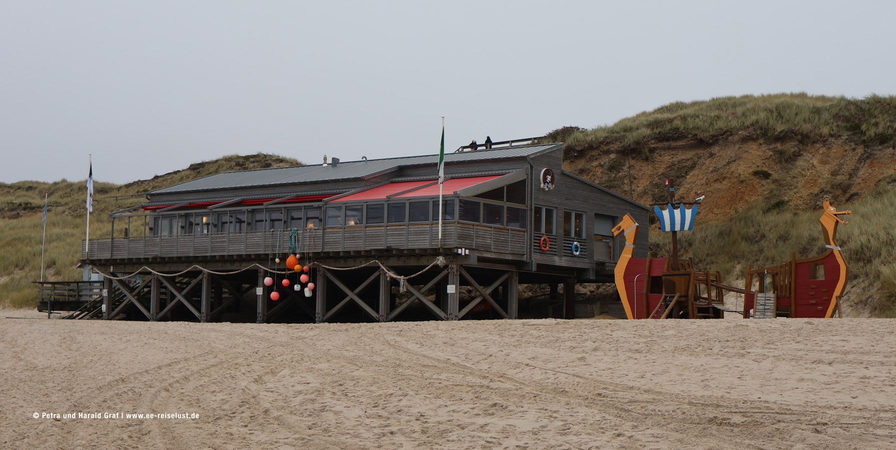 Nach einem Rundgang ging es wieder zurück. Die Luft salzig, die Aussicht fantastisch. Leider war der Wellengang eher zurückhaltend. Also wieder runter zum Strand (hätten auch den Bohlenweg auf dem Kliff nehmen können, aber wir lieben den Sand) und auf zu Onkel Johnnys Strandwirtschaft. Urig eingerichtet.