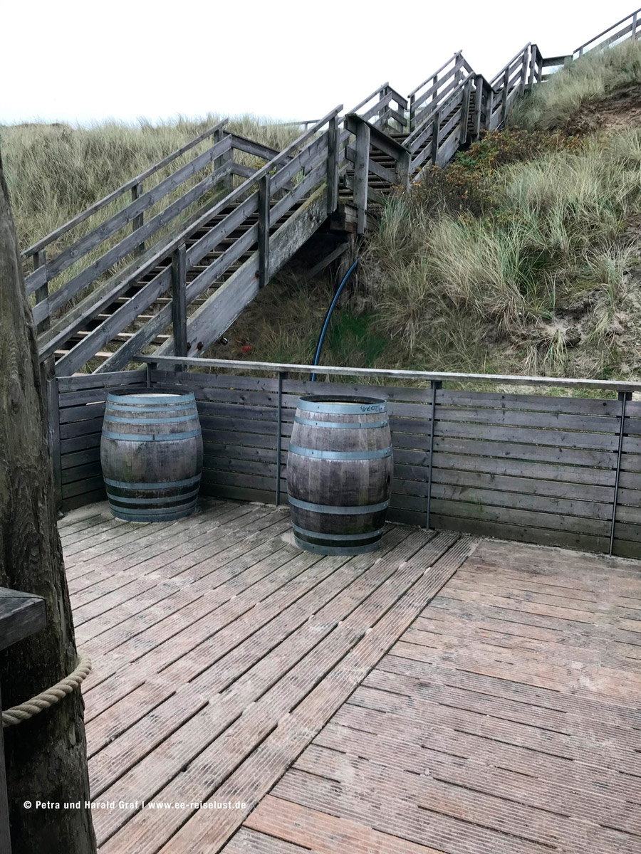 Aber der nun stärker werdende Hunger trieb uns zu Fisch Blum. Also wieder runter, die Strandstraße in die entgegengesetzte Richtung und rein zu Fisch Blum. Das Bistro war gut besetzt, aber wir fanden noch einen Tisch für zwei. Wir bestellten uns Sylter Edelfischsuppe mit Gemüse und Baguette und Seelachsfilet vom Grill, mit Bratkartoffeln und tranken zwei Flens, eins mit und eins ohne Alkohol. Plopp. Lecker gegessen und für Sylt günstig, machten wir uns wieder zurück zum Hotel. Der Koffer wollte ausgepackt werden. Aber erst müssen wir noch ans Meer. Treppen runter und schon standen wir am Strand.